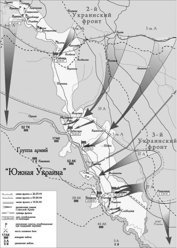 30 марта была освобождена Рыбница и близлежащие села. На кишиневском направлении войска приближались к реке Реути Оргееву. К 5 апреля части 53-ей армии завязали бои на подступах к Дубоссарам. Были освобождены Михайловка, Гармацкое, Ботошаны, Гояны, Цыбулевка, Дойбаны, Ново-Александровка, Ягорлык, Новые Погребы. 5-ая гв. армия вела бои на подступах к Карманово и Павловке. 11 апреля был освобожден районный центр Слободзея, села Ближний Хутор, Калкатова Балка, Суклея, Карагаш, Чобру- чи, Коротное, Глиное, Незавертайловка. |