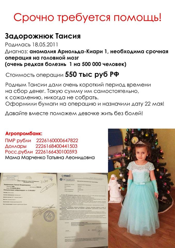 Уважаемые приднестровцы, еще один ангелочек нуждается в нашей помощи! У восьмимесячной Денисовой Арины неутешительный диагноз - атрезия желчевыводящих путей, желчного пузыря и воротной вены. Цирроз печени. Врачи поставили малышке диагноз в 3,5 месяца, после чего было принято решение начать лечение для подготовки трансплантации (пересадки) печени. Операция будет проводиться в Кишиневе под чутким руководством специалистов из Испании и Румынии. Мать девочки выступает донором. Сейчас она проходит всевозможные обследования перед операцией. Стоимость самой операции 120 000$. Но Ариночке очень повезло, операцию ей проведут бесплатно, так как у нее интересный случай. Страшно представить, что колоссальный труд врачей и мучения матери могут пройти зря. После операции маленькой Арине и ее матери предстоит дорогостоящая реабилитация, потребуется около 5000$! Уважаемые приднестровцы, не оставайтесь равнодушными, давайте Поможем вместе этой семье побороть страшный недуг! 2226110000097114 - карта "Радуга" Агропромбанк 2221380007508060 - Сбербанк Денисова Екатерина Леонидовна (мать Арины) |