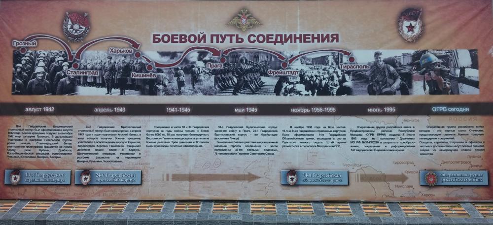 Боевой путь соединения с 1942 по настоящее время. 1942 август - 10-й Гвардейский Будапештский стрелковый корпус был сформирован в августе у 1942 года. Боевое крещение получил в сентябре 1942 года западнее Грозного. В дальнейшем Участвовал в разгроме Гизельской группировки немцев, Сталинградской битве, уничтожении группировок фашистов на левом берегу реки Кубань, Донбассе, Ясско-Кишинёвской операции, освобождении Румынии, Югославии, Венгрии, Австрии. 1943 апрель - 24-й Гвардейский Братиславский стрелковый корпус был сформирован в апреле 1943 года в ходе подготовки Курской битвы, в ходе которой получил боевое крещение, участвовал в освобождении городов Харькова, Кировограда, Херсона, Николаева. Прикрывал действия наших войск в Корсунь-Шевченковской операции. Участвовал в разгроме фашистов на территории Венгрии, Румынии, Чехословакии. 1941-1945 Соединения и части 10 и 24 Гвардейских корпусов за годы войны прошли с боями более 8000 км, 60 раз получали благодарность Верховного Главнокомандующего за успешные боевые действия. Трём дивизиям и 12 полкам были присвоены почетные наименования. 1945 май - 10-й Гвардейский Будапештский корпус закончил войну в Праге, 24-й Гвардейский Братиславский корпус - во Фрейштадте (восточнее Линца). За активные боевые действия и проявленный масовый героизм соединения и части награждены 33-мя боевыми орденами, 78 человек стали Героями Советского Союза. В ноябре 1956 года на базе частей 10-го и 24-го Гвардейских стрелковых корпусов была сформирована 14-я Гвардейская Общевойсковая армия, вошедшая в состав Одесского воемого округа. Штаб армии разместился в Тирасполе Молдавской ССР. 1995 июль - Оперативная группа российских войск в Приднестровском регионе Республики Молдова (ОГРВ ПРРМ) создана 1 июля 1995 года на основании Директивы МО РФ №314/2/0296 в результате преобразования, сокращения и реформирования 14 Гвардвйской Общевойсковой армии. ОГРВ сегодня - Оперативная группа российских войск сегодня - это верные сыны Отечества, продолжающие славные боевые традиции легендарных соединений. Солдаты, сержанты, старшины и офицеры честью и достоинством несут боевые она мена, озаряя их немеркнущей славой русского воинства. |