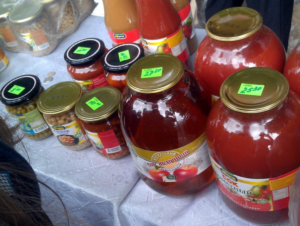 Продукция каменского консервного завода - зеленый горошек, отличный 100% яблочный сок по 27 рублей, томатный сок - 25 рублей. |