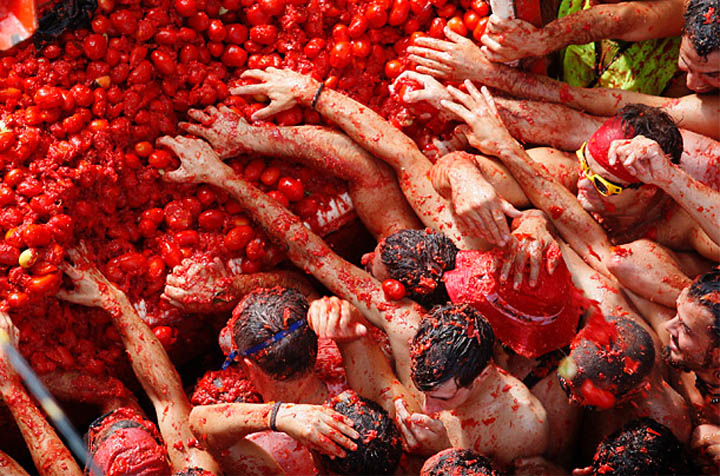 уже не первый год хочу попасть в Буньоль , на фестиваль томатов . Вот его описание из википедии ))) Первые события Ла Томатины начинаются с 10 часов утра. Множество грузовиков, гружённых помидорами въезжают на центральную площадь города Плаза-дель-Пуэбло. Томаты везут из соседнего автономного сообщества Эстремадура, где они дешевле. По правилам фестиваль начинается только после того, как кто-нибудь залезет на деревянный столб высотой в 2 этажа, предварительно смазанный мылом. На верху столба смельчака ожидает свиной окорок (хамон). Сигналом к началу боя служит выстрел из водяных пушек. В процессе сражения каждый участник сам за себя. Правила требуют, что для избежания травм перед броском помидор должен быть раздавлен. Также по правилам нельзя приносить с собой предметы, способные нанести серьёзные повреждения, например, стеклянные бутылки. Хаос длится ровно час, после чего водомёты делают второй залп, подавая сигнал к завершению сражения. После этого момента помидорами бросаться больше нельзя. После битвы стены окружающих домов становятся красными, а томатная жижа на мостовой доходит до щиколоток. В процессе очистки пожарные автомобили смывают остатки томатов водой, которая подаётся из римского акведука, проходящего к северу от города. Участники отмываются в реке, или их окатывают из шлангов местные жители. в общем ПОКИДАТЬСЯ ПОМИДОРАМИ ХАЧУ !!!!!!!!!!!!! )))))))))))))) |