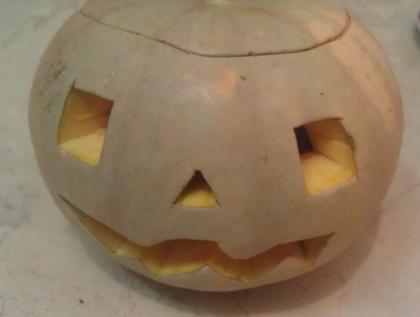 Но отметить не помешает. Лучше всего один раз купить большую тыкву, вытащить из неё все внутренности до корки, вырезать страшную рожу, и положить тыкву высыхать в духовке. От этого тыква станет красивее - на ней появятся морщины, рожа станет еще страшнее. Тыкву можно будет использовать много раз.
