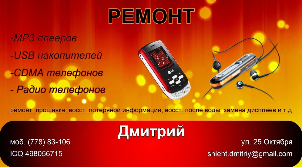 Быстро и качественно по сниженным ценам ремонт с гарантией. Постоянным клиентам скидки! -MP3 плееров (ремонт, прошивка, восст. после воды, восст. потеряной информации) -USB накопителей (ремонт, прошивка, восст. потеряной информации) -CDMA и GSM телефонов (ремонт, восст. после воды., удара, замена шлейфов, дисплеев, корпусов) - Радио телефонов ----------------------- ОБЪЯВЛЕНИЕ СНЯТО! Дмитрий ICQ 494056715 моб. 778-83106 |