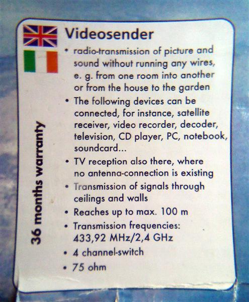 Продаю вот такую штуковину - видео/аудио(стерео) удлинитель WELLTECH 40590.Может использоваться для беспроводной передачи информации от одного источника сигнала к другому.Например с видео/аудио выходов DVD проигрывателя(видеокарты, видеокамеры,телевизора) до видео/аудио входа телевизора в другой комнате, от выхода аудиокарты компьютера до активной акустики и т.д. вариаций на тему очень много....Дальность по паспорту 100 метров, но это по прямой, в условиях застройки до 30 метров.По крайней мере в 3-х комнатной квартире беспроблем работал сквозь стены.Есть возможность подключения специального ИК передатчика к устройству которым будем управлять(в комплекте). Штука практически новая, включал пару раз...