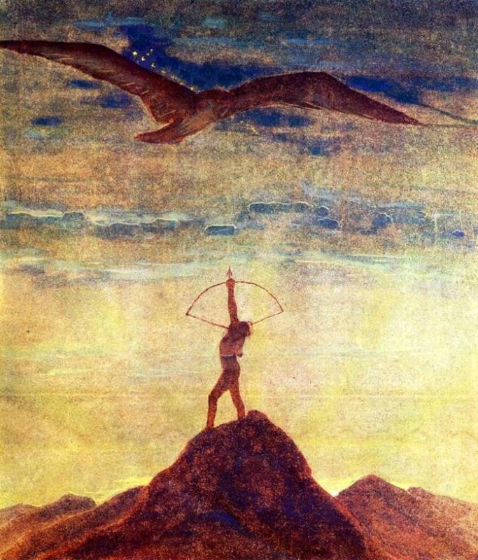 На картине с луком и птицей явные косяки с перспективой. Птица уже давно улетела, пока он целился.