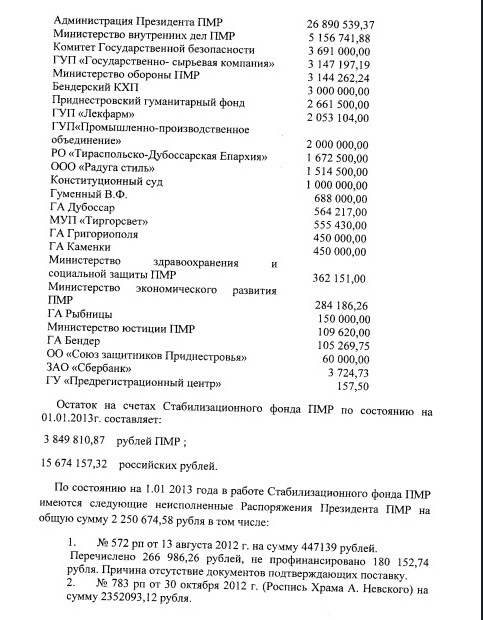 грустно, но рыба гниет с головы и мы все как бы ни хотели образовать общество взаимопомощи и братской поддержки, как наши предки, вряд ли сможем объединиться с ,например, администрацией президента с ее зарплатами из стабфонда ![]() ( которого , вдобавок, вроде-бы и нет)![]() Как заявил А.Дирун в своем комментарии «Об отчете Правительства Приднестровья» — «по заявлению П.П. Степанова Стабфонда не существует». Это не соответствует действительности. «В период с 1 мая 2012 года по 1 января 2013 года Стабилизационный фонд ПМР осуществлял свою деятельность по привлечению средств в соответствии с Постановлением Правительства ПМР от 28 апреля 2012 года № 41 „Об утверждении положений о порядке распределения денежных средств, аккумулирующихся на специальных счетах...“ и расходовании на цели определенные Президентом ПМР» — это цитата из документа. Так вот Шевчук очень интересно определял цели расходования. Ниже представлен скрин части документа по доходам и расходам фонда. Оригинальным выглядит масштабное расходование средств на саму Администрацию президента, силовые структуры и Приднестровский гуманитарный фонд. Деньги выдавали и лично Гуменному. А на какие нужды не понятно. http://forum.dnestra.com/blog/policy/1351.html