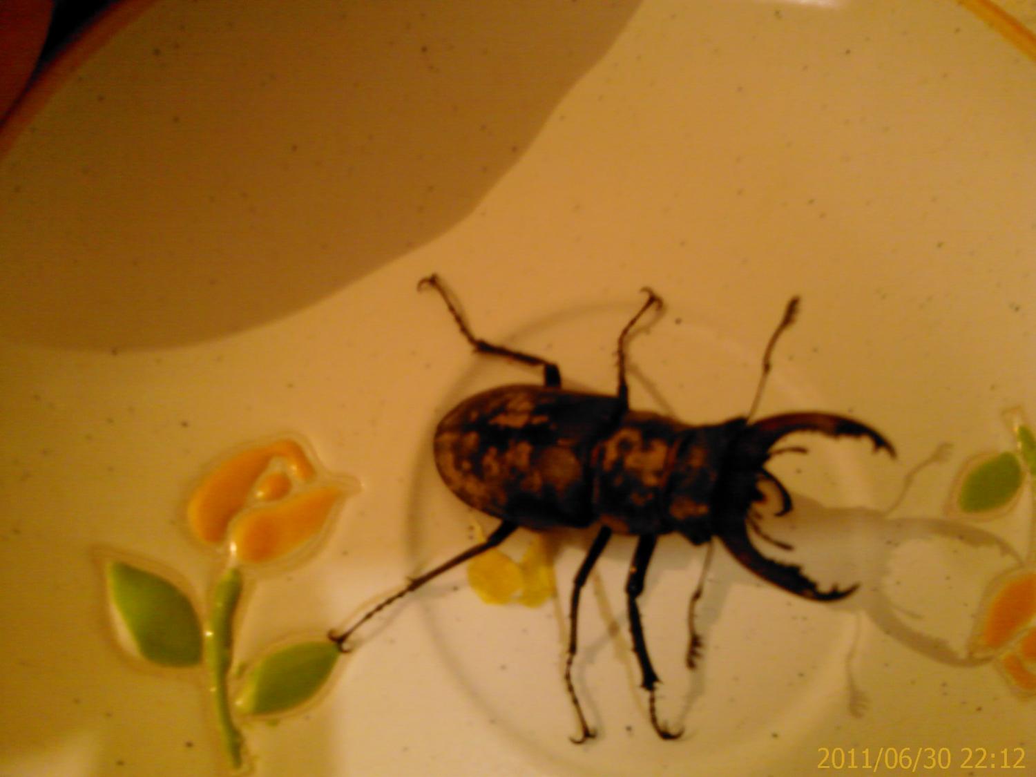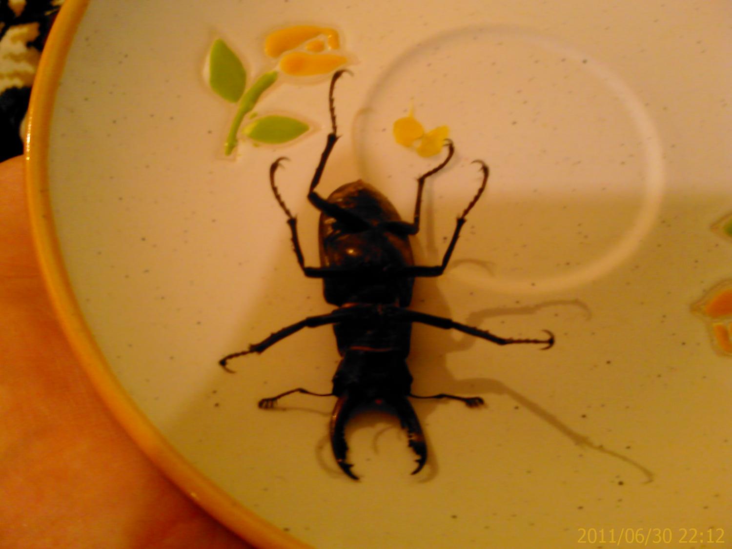 симпатяга-хотя насекомых не люблю,но этот жук какой то прикольный-позирует на фотках. В детстве с двоюродным братом ловили тарантулов на пластилин и нитку-кто помнит,было такое развлечение.Данте,поищи по интернету,как твой питомец называется-у него такие клещни впереди.