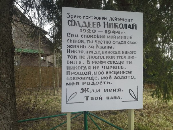 2)На табличке указано, что лейтенант Фадеев 1920 года рождения, а в данных о погибшем лейтенанте Фатееве фигурирует 1921 год. Однако место и дата гибели, воинское звание позволяют предположить, что Фадеев и Фатеев – это один и тот же человек.