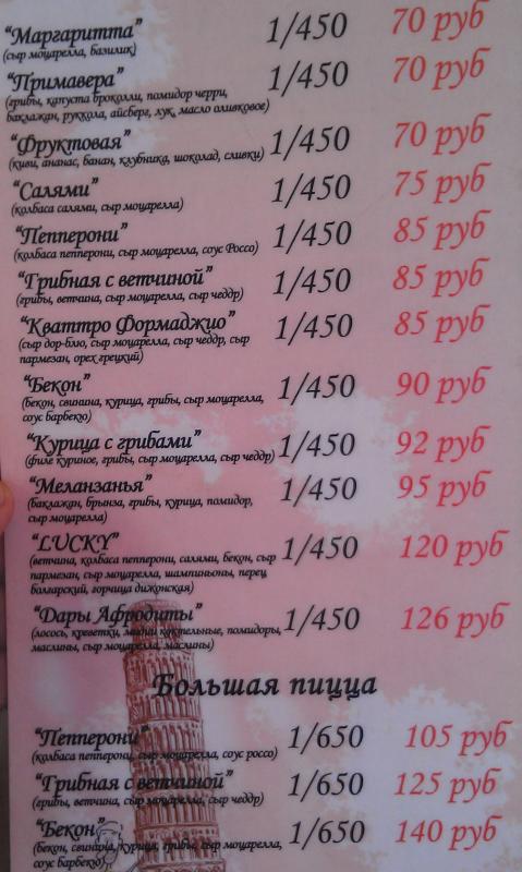 Ну и на последок, меню с ценами на пиццу, выпивку и закуски в кафе Лаки: Да, пиво там кишиневское и козел разливное по 25р разливное, неплохое. |