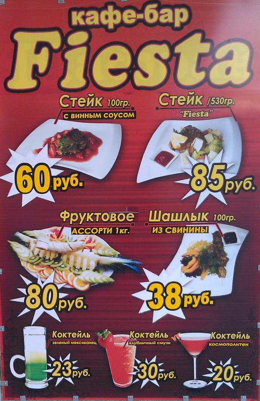 Кафе-бар Фиеста (Fiesta)- находится в Тирасполе на красных казармах, только недавно открылся. вот сфоткал рекламный щит с ценами.