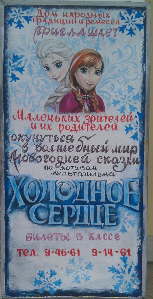 Тираспольский дом ремесел. Набор в народный хор русской песни "Родные напевы". Среда - суббота в 5 дня. Телефон: 533 91461. Спектакль - "Холодное сердце". |