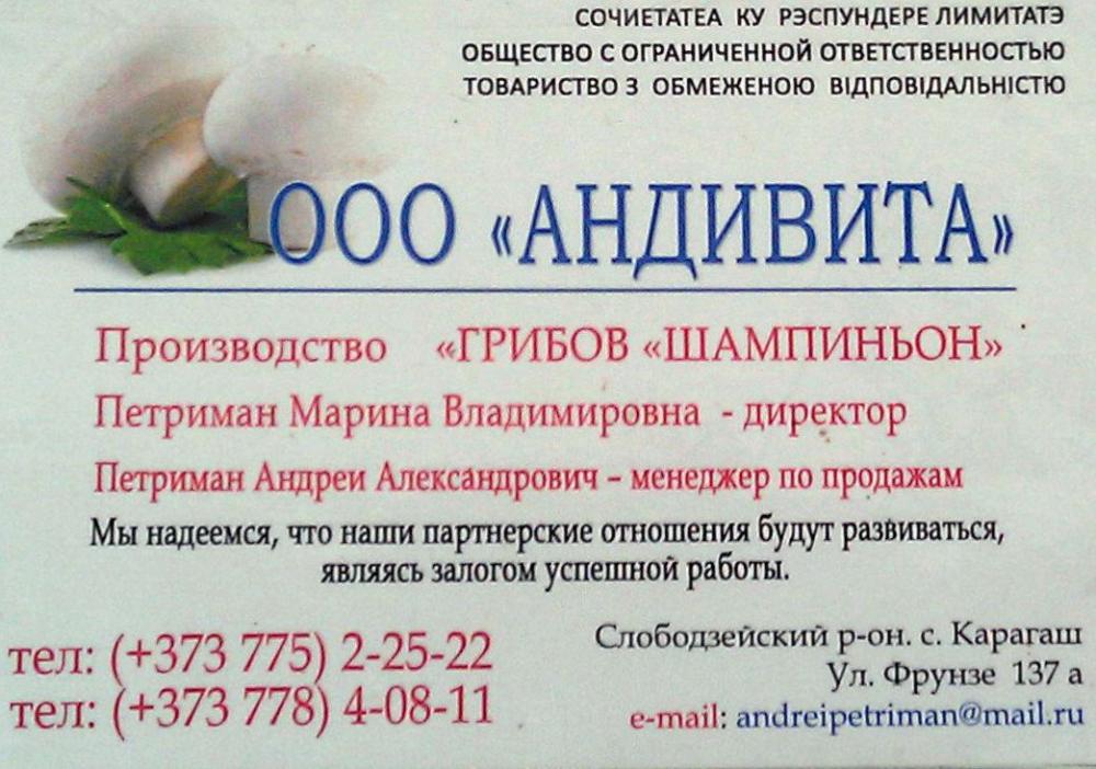Производство «ГРИБОВ «ШАМПИНЬОН» Петриман Марина Владимировна - директор Петриман Андреи Александрович - менеджер по продажам Мы надеемся, что наши партнерские отношения будут разбиваться, являясь залогом успешной работы. тел: (+373 775) 2-25-22 Слободзейский район. тел: (+373 778) 4-08-11 e-mail: andreipetrirnan@mail.ru |