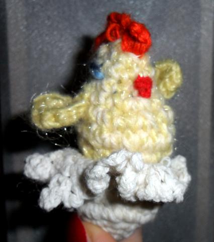 У меня немножко другой был цыпленок, как объяснить....вообщем вырезали с картона два кружка, внутри кружка делали тоже кружки, потом обматывали желтой вязальной ниткой и обрезали, потом приклеивали их друг к другу , потом делали глаза, клюв и кепку)))