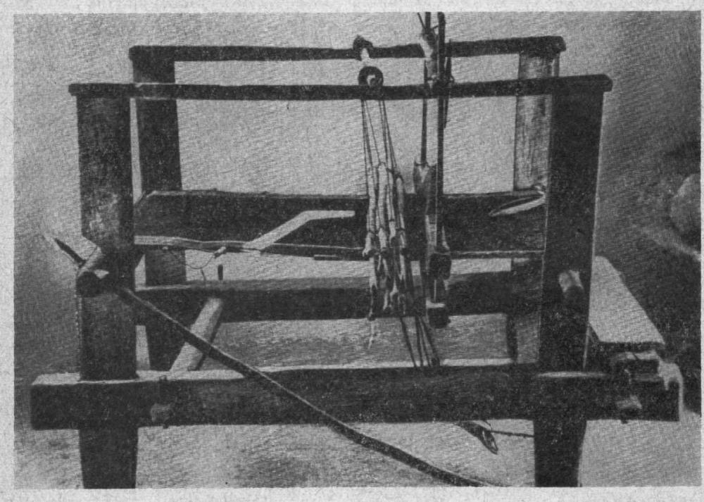 Чаще всего встречалось тканье на подножках (цесутул ын доуэ, трей, патру ... ице). Сущность техники тканья на подножках состоит в ритмическом чередовании нитей основы и утка, последовательность которого не изменяется на протяжении всего процесса тканья. Используя технику тканья на подножках, мастерицы получали полотняные ткани с самым простым переплетением нитей, а также с более сложным переплетением — узорные. Полотняное переплетение нитей — наиболее древнее из всех существующих форм тканья. Такие ткани были известны еще в эпоху трипольской культуры. Техникой полотняного переплетения, выполненной в основном на двух подножках, ткали главным образом холсты для рубах, полотенца, дорожки, ковры и др. Такой техникой одна женщина за день может выткать приблизительно 8 — 9 локтей (коцъ) холста. Рис. 39. Горизонтальный ткацкий станок (стативе) |
