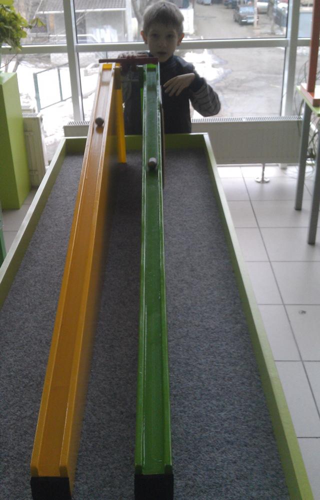 Поставь оба шарика в начальную точку, и подними перегородку так, чтобы шары начали свое движение одновременно.