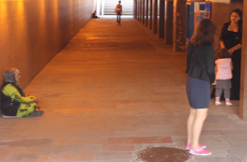 Метро в Москве И под конец фотоотчета немного городской "романтики" Попрошайки в подземном переходе - маленькая девочка при сидящей маме просит у итальянских женщин денег. Бомжи в Москве |