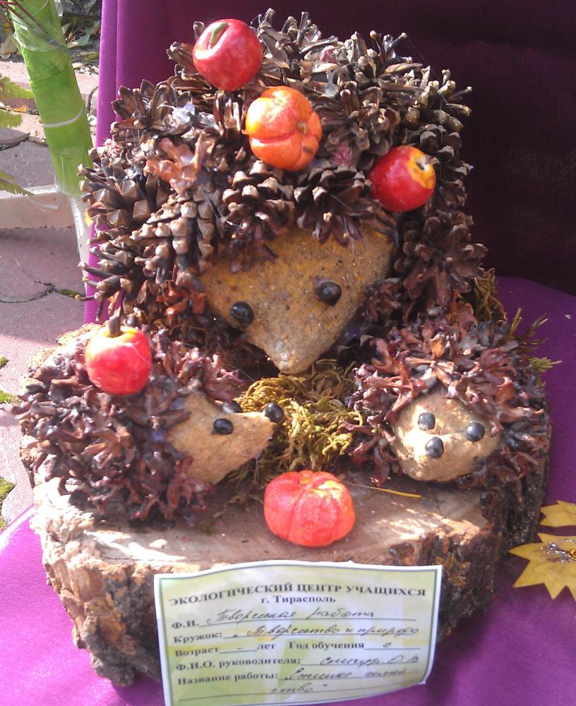 Вот последняя детская поделка ребенка - человечек с колючей головой и шапочкой с плюски желудя. |