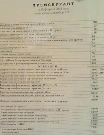 Сегодня вынуждено был в относительно новом офтальмологическом центре "Микрохирургия глаза" в Тирасполе. Впечатления: очередей нет, цены - высокие, оборудование - новейшее, этика общения на 5. В общем, консультация за 210 рублей включила в себя полную проверку зрения на 5-6 аппаратах, заключение врача, рецепт по моей проблеме. Находится этот офтальмологический центр напротив Магазина "Орион". Цены: График работы: Понедельник - пятница с 8 до 17. Суббота 9-13 Телефон: 533 71222